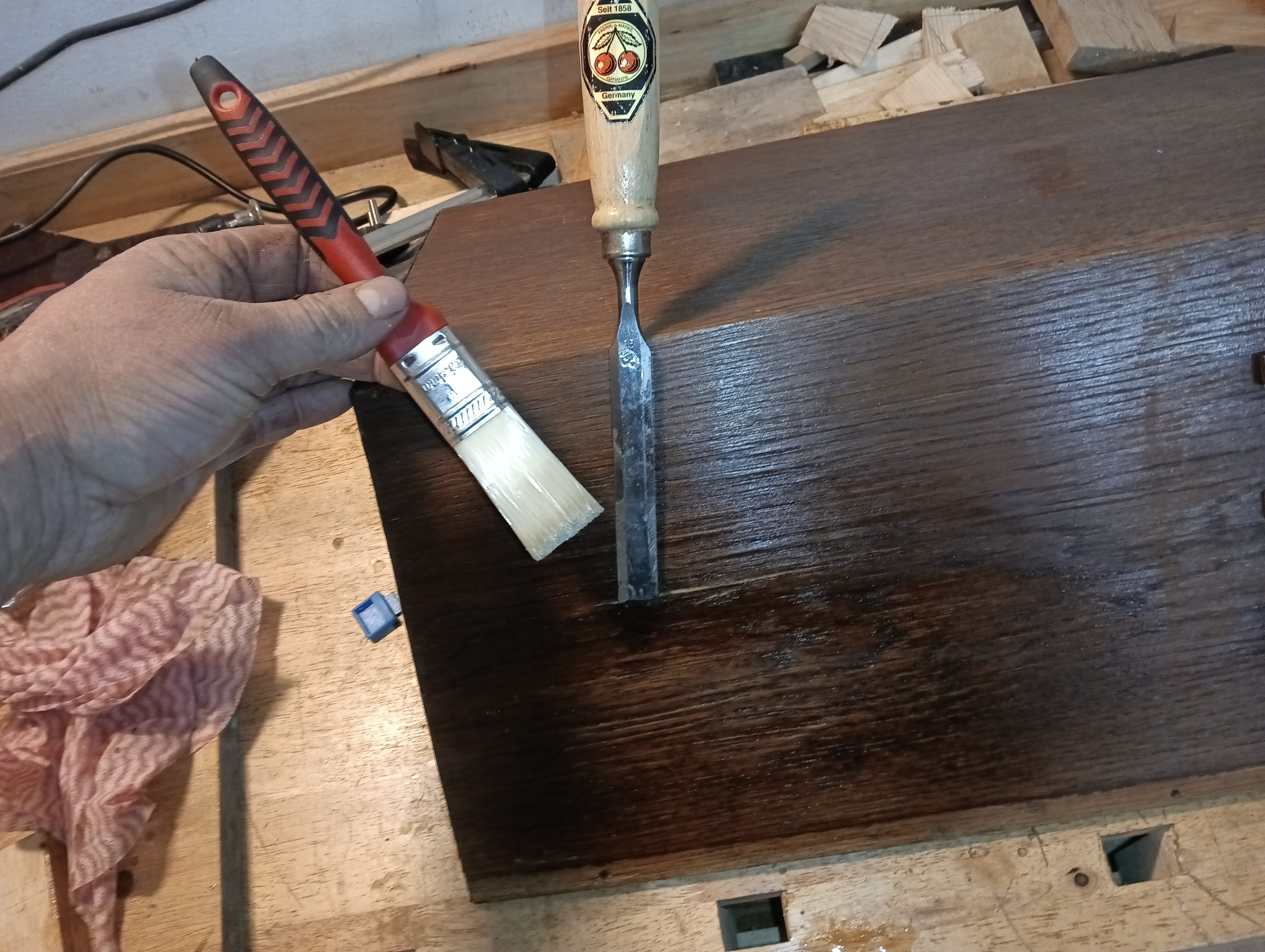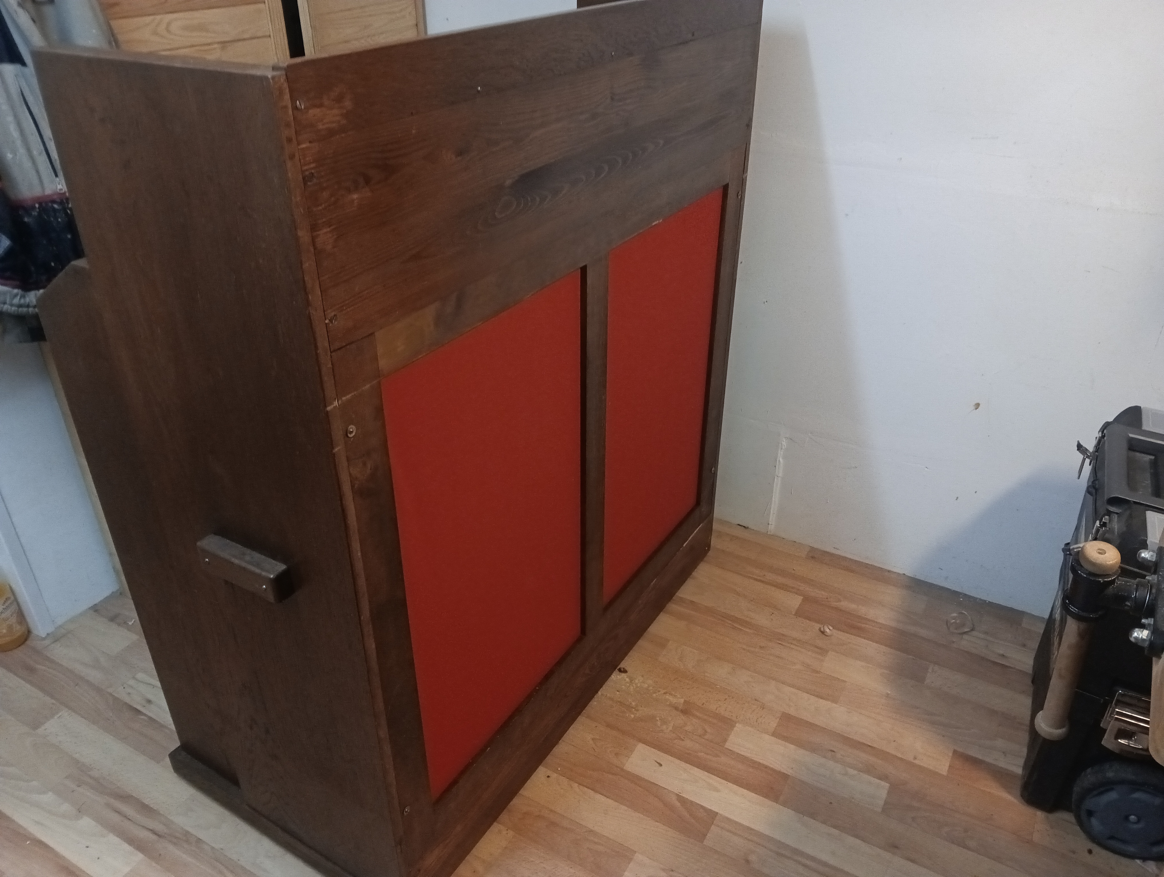 Durch den feuchten Standort löste sich an einigen Stellen das Funier. Diese Stellen bekamen eine Sonderbehandlung mit Warmleim und Schraubzwingen! Anschließend wurde die Oberfläche des Gehäuse gereinigt und aufgefrischt! links: Vorher rechts: Nachher Nach mehreren Auffrischungsvorgängen konnte sich das Ergebnis sehen lassen. |
